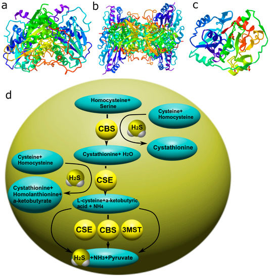 Structural organization of the enzymes responsible for the formation of H2S and H2S biosynthesis. 3D-model of the structural organization: (a) cystathionine-β-synthase (CBS), (b) cystathionine γ-lyase (CSE), and (c) 3-mercaptopyruvate sulfurtransferase (3-MST). (d) Variety of pathways for H2S biosynthesis under the action of enzymes CBS, CSE, and 3-MST.