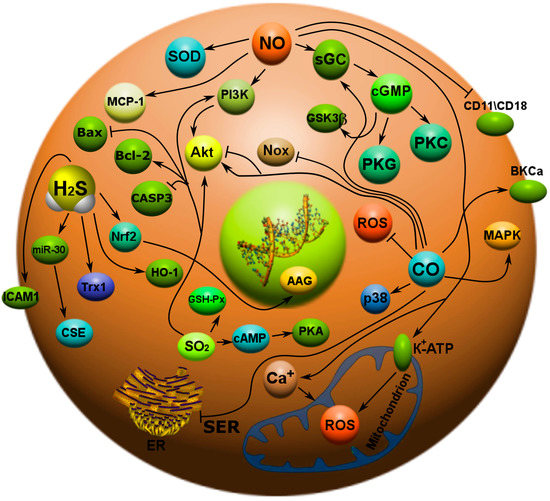 Possible gasotransmitter-dependent signaling mechanisms regulating apoptosis in cardiovascular diseases. NO, nitric oxide; CO, carbon monoxide; H2S, hydrogen sulfide; SO2, sulfur dioxide; SOD, superoxide dismutase; sGC, soluble guanylyl cyclase; cGMP, cyclic guanosine monophosphate; PKA, protein kinase G; PKC, protein kinase C; PKG, protein kinase G; PI3K, phosphoinositide 3-kinases; Akt, protein kinase B; Bax, bcl-2-like protein 4; Bcl-2, B-cell lymphoma 2; CASP3, cysteine-aspartic acid protease 3; MCP-1, monocyte chemoattractant protein 1; miR-30, microRNA-30; Trx1, thioredoxin 1; CSE, cystathionine γ-lyase; ICAM1, intercellular adhesion molecule 1; HO-1, heme oxygenase 1; GSH-Px, glutathione peroxidase; cAMP, cyclic adenosine monophosphate; MAPK, mitogen-activated protein kinase; p38, mitogen-activated protein kinase p38; BKCa, large conductance calcium-activated potassium channels; CD11\CD18, beta2 integrins, members of the integrin family; Nox, NADPH oxidase; K+-ATP, ATP-sensitive potassium channels; ROS, reactive oxygen species; Nfr2, nuclear factor erythroid 2-related factor 2; ER, endoplasmic reticulum; SER, stress endoplasmic reticulum; AAG, anti-apoptotic genes. Arrows with a sharp end—positive regulation; arrows with a blunt end—negative regulation.