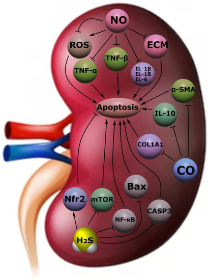 Possible gasotransmitter-dependent signaling mechanisms regulating apoptosis in kidney diseases. NO, nitric oxide; CO, carbon monoxide; H2S, hydrogen sulfide; ROS, reactive oxygen species; TNF-α and TNF-β, tumor necrosis factors; ECM, extracellular matrix; interleukins, IL-1β, IL-18, IL-10, and IL-6; α-SMA, smooth muscle alpha-actin; COL1A1, type 1 collagen; Bax, bcl-2-like protein 4; Nfr2, nuclear factor erythroid 2-related factor 2; mTOR, mammalian target of rapamycin; CASP3, cysteine-aspartic acid protease 3; NF-κB, nuclear factor kappa-light-chain-enhancer of activated B cells. Arrows with a sharp end—positive regulation; arrows with a blunt end—negative regulation.