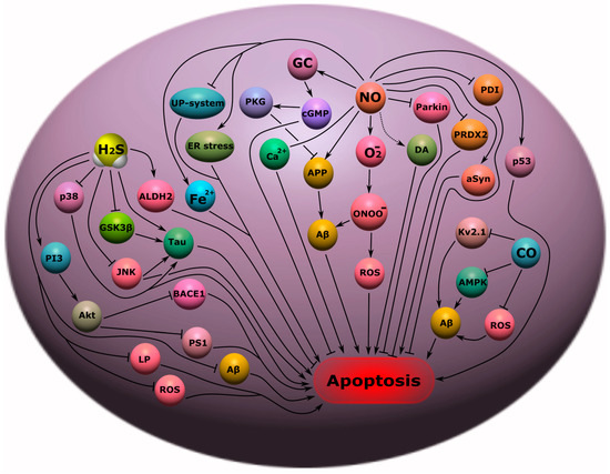 Possible gasotransmitter-dependent signaling mechanisms regulating apoptosis in neurodegenerative diseases. NO, nitric oxide; CO, carbon monoxide; H2S, hydrogen sulfide; ROS, reactive oxygen species; O2−, superoxide anion radical; ONOO−, peroxynitrite; GC, guanylyl cyclase; cGMP, cyclic guanosine monophosphate; PKG, protein kinase G; Ca2+, calcium ions; APP, amyloid-beta precursor protein; Aβ, amyloid beta; UP-system, ubiquitin-proteasome system; ER stress, endoplasmic reticulum stress; Fe2+, iron ion; p38, p38 mitogen-activated protein kinases; GSK3β, glycogen synthase kinase-3 beta; ALDH2, aldehyde dehydrogenase 2; PI3, phosphorus triiodide; Akt, protein kinase B; LP, lipid peroxidation; JNK, c-Jun N-terminal kinases; Tau, microtubule-associated protein tau; BACE1, beta-site APP cleaving enzyme-1; PS1, presenilin-1; Parkin, E3 ubiquitin ligase; DA, dopamine; PDI, protein disulfide-isomerase; PRDX2, peroxiredoxin 2; aSyn, alpha-synuclein; Kv2.1, voltage-gated potassium channel KV 2.1; AMPK, AMP activated protein kinase. Arrows with a sharp end—positive regulation; arrows with a blunt end—negative regulation.