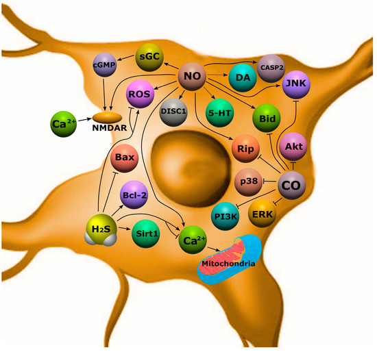 H2S-dependent regulation of apoptosis can be carried out through the modulation of the activity of NMDA receptors, which provide the incoming current of calcium and depolarization of cell membranes. Violation of their functions leads to Ca2+ excitotoxicity and cell death of neurons through apoptosis. H2S can directly interact with cysteine residues of NMDA receptor subunits through their S-sulfhydration and modulate their activity through a number of signaling pathways, for example, by activating PKA [60]. It should be noted that H2S, as in the case of NO and CO, can regulate the level of anti- and pro-apoptotic groups of proteins. Moreover, it can interact with them directly through S-sulfhydration or persulfhydration of cysteine residues and through activation or inhibition of signaling mechanisms. It has been shown that H2S can either activate or inhibit the expression of p53 [61,62], caspase-3, Bax, and a number of other proteins involved in apoptosis [56]. However, the subtle H2S-dependent mechanisms of regulation of anti- and pro-apoptotic proteins remain poorly understood.
