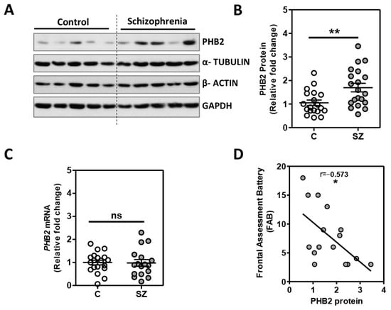 2.1. Analysis of PHB2 Levels in Postmortem Dorsolateral Prefrontal Cortex in Schizophrenia