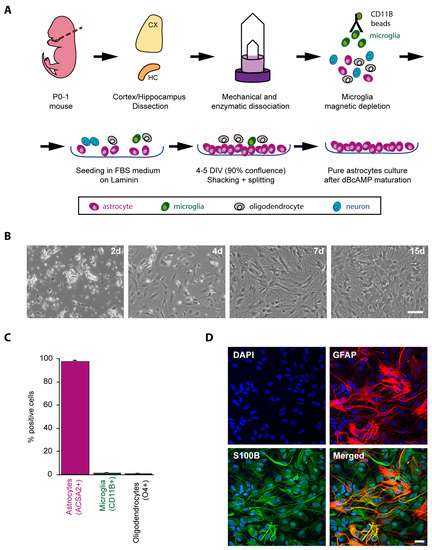 Obtaining a purified postnatal primary astrocyte culture. (A) Scheme of the protocol for obtaining purified astrocyte cultures (CX, cortex; HC, hippocampus; DIV, days of culture in vitro). (B) Pictures of the astrocytes at different days of culture. Bar indicates 100 µm. (C) Cytometry analyses of purified astrocytes after 10 days of maturation with DB-cAMP. The percentage of cells that were positive for anti-ACSA2 (astrocyte marker), anti-CD11b (microglia marker), and anti-O4 (oligodendrocyte marker) are indicated. Results are the mean of three independent experiments. (D) Immunofluorescence analyses of purified astrocytes. A representative immunofluorescence image of primary astrocyte cultures stained with anti-GFAP (red) and S100B (green) is presented. Nuclei were stained using DAPI (blue). Bar indicates 25 µm.