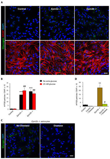Primary astrocytes from LD mouse models accumulate polyglucosan inclusions (PGBs). (A) Astrocyte primary cultures from control Epm2a−/− and Epm2b−/− mice grown in DMEM + 10% FBS medium with 7.5 mM glucose for 24 h were obtained and analyzed with immunofluorescence using anti-glycogen (green) and anti-GFAP (red) antibodies. Nuclei were stained with DAPI (blue). Bar indicates 25 µm. (B) Quantification of the number of PGBs per cell in astrocytes grown after maturation during 24 h in media containing either no extra glucose or 25 mM glucose. Values are the mean +/− SEM of at least six independent experiments (*** p < 0.001, LD astrocytes with respect to the control in DMEM + 10% FBS medium with no extra glucose added; ## p < 0.01, LD astrocytes with respect to the control in 25 mM glucose). (C) PGBs accumulated in LD astrocytes are sensitive to diastase treatment. Representative images of Epm2b−/− astrocyte cultures treated with 1 mg/mL diastase for 10 min at 37 °C and processed by immunofluorescence with an anti-glycogen (green) antibody and DAPI (blue) are shown. Bar indicates 25 µm. (D) Quantification of the number of PGBs per cell in astrocytes after diastase treatment in control and Epm2b−/− astrocytes. Values are the mean +/− SEM of at least three independent experiments (** p < 0.01, Epm2b−/− astrocytes with respect to the control; # p < 0.05, Epm2b−/− astrocytes with respect to untreated cells).