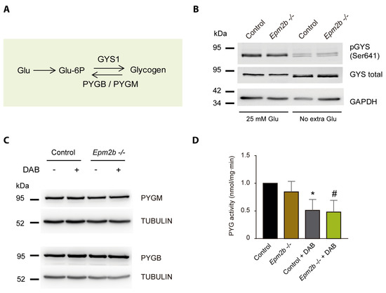 To understand why LD astrocytes accumulated more polyglucosan inclusions, we analyzed the levels and activity of the enzymes involved in their synthesis and degradation. Although glycogen homeostasis is a complex process involving a full set of different enzymes (glycogen synthase, glycogen branching enzyme, glycogen phosphorylase, and glycogen debranching enzyme, among others) [32], we focused our attention on glycogen synthase and glycogen phosphorylase (Figure 3A). It is known that astrocytes express the muscular isoform of glycogen synthase (GYS1). This enzyme is inactivated by phosphorylation in different residues and is activated by dephosphorylation [32]. It has been previously demonstrated that there are no changes in the activity of GYS1 in either brain or muscular tissue from LD mice [33]. Consistently with these results, we observed no changes in the amount of GYS1 or its phosphorylation status in extracts from astrocytes from control or Epm2b−/− mice, grown for 24 h in the absence of extra glucose or in 25 mM glucose (Figure 3B). Astrocytes mainly express two isoforms of glycogen phosphorylase, the muscular (PYGM) and the brain (PYGB) isoforms, which differ in their means of becoming activated either by phosphorylation or by allosteric regulation with AMP [34,35]. We analyzed the levels of both PYGM and PYGB in Epm2b−/− astrocyte extracts and found no differences in comparison to the control (Figure 3C). We detected no change in the overall glycogen phosphorylase activity between Epm2b−/− and control astrocytes (Figure 3D), and this activity was similarly reduced in both cases in the presence of 1,4-dideoxy-1,4-imino-d-arabinitol (DAB), an inhibitor of glycogen phosphorylase [36]. These results indicated that, in Epm2b−/− astrocytes, there were no major differences in the studied enzymes related to glycogen synthesis and degradation, in comparison to the control cells.