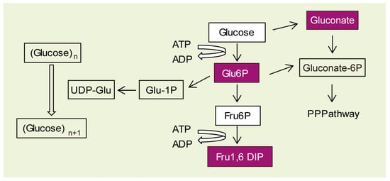 The higher levels of Glu-6P, Fru1,6 diP, and gluconate are consistent with our recent observation that astrocytes from Epm2b−/− mice have increased glucose uptake [37]. This enhanced glucose uptake may be responsible for higher levels of Glu-6P, which could improve glycogen biosynthesis (Figure 4) [32].
