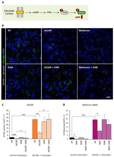 Since it is thought that the accumulation of polyglucosan inclusions is the trigger for LD pathophysiology [17], different strategies have recently been implemented to decrease the synthesis of PGBs by decreasing the expression/activity of GYS1 (see Introduction). Alternatively, we considered improving the degradation of PGBs by increasing the activity of endogenous glycogen phosphorylase (PYG) (Figure 3A). The activity of PYG is regulated by two main mechanisms, phosphorylation and allosteric activation by AMP. In the case of phosphorylation, PYG is phosphorylated by an activation cascade initiated by an increase in the levels of cAMP; this activates protein kinase A (PKA), leading to the phosphorylation of glycogen phosphorylase kinase (PHK), which is responsible for the phosphorylation of PYG (Figure 5A) [34,35]. Using the Epm2b−/− astrocyte cultures as a disease model, we treated them with different compounds that activate adenylate cyclase (e.g., forskolin; propranolol), but we observed no differences in the levels of polyglucosan inclusion after the treatment, suggesting that the activation of PYG by phosphorylation did not affect the degradation of polyglucosans. On the contrary, treatment for 24 h of the Epm2b−/− astrocytes with AICAR, an analog of AMP [38], reduced the levels of polyglucosans by 70% (Figure 5B,C). The action of AICAR was mediated through PYG activity, since no reduction in the levels of polyglucosans was detected in the presence of AICAR plus DAB (AICAR + DAB) (Figure 5B,C).