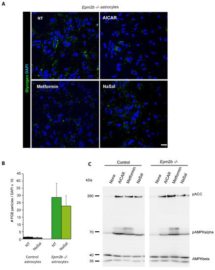 Since both AICAR and metformin are known to be activators of AMP-activated protein kinase (AMPK) [38,39], we wanted to check whether the positive action of these two drugs on the degradation of polyglucosans could be mediated by the activation of AMPK, in addition to the activation of PYG. With this aim, we treated Epm2b−/− astrocytes with salicylate, a direct activator of AMPK [41], and, although we observed an activation of AMPK, both as an increase in the phosphorylation status of the catalytic AMPKalpha subunit (P-AMPKalpha) and as an increase in the phosphorylation of one of its canonical substrates (acetyl-CoA carboxylase; P-ACC) (Figure 6C), no degradation of the polyglucosan inclusions was observed (Figure 6A,B). These results suggested that the activation of AMPK, by itself, played a minor role in the degradation of the polyglucosans present in Epm2b−/− astrocytes.
