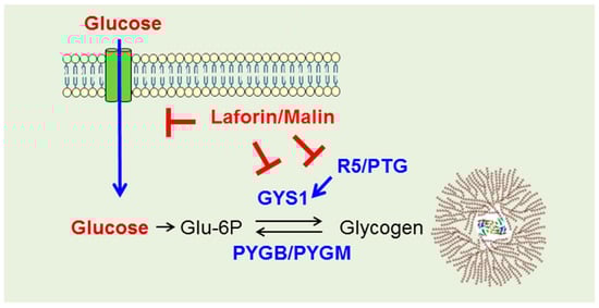 This increase in the supply of Glu-6P would have a primary effect on glycogen synthesis. However, additional roles of the laforin/malin complex in the formation of polyglucosan inclusions have also been described. As laforin contains a carbohydrate-binding module (CBM20) at its N-terminus, this allows the protein to bind to polysaccharides, especially those with fewer branches, attracting malin to these sites and allowing for the ubiquitination of proteins related to glycogen metabolism such as the regulatory subunit R5/PTG of protein phosphatase 1, glycogen synthase, and others [4,6]. Therefore, the laforin/malin complex may have a dual role: one regulating glucose uptake, and another regulating glycogen synthesis (Figure 7).