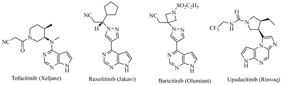 Chemical structures of four US FDA approved JAK inhibitors with brand names in parenthesis.