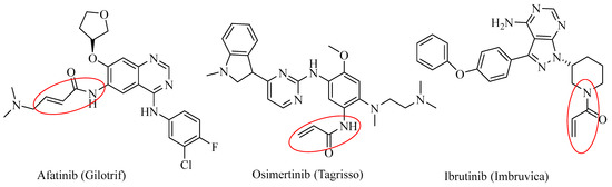 Chemical structures of three US FDA approved covalent drugs with brand names in parenthesis. The Michael addition moiety is highlighted by a red circle.