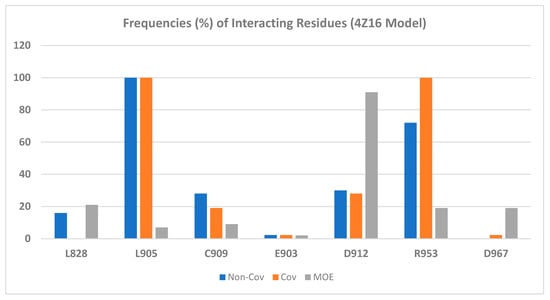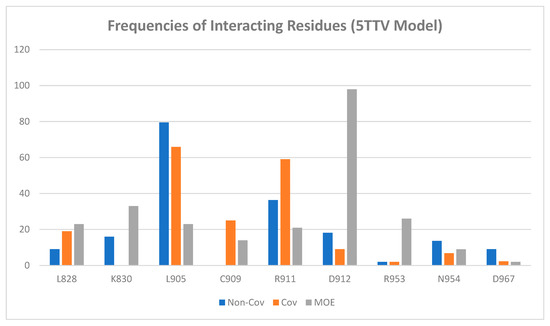 The analysis of the protein–ligand interactions between the 5TTV mutant model and the 43 ligands revealed that L905 is still one of the most important residues for ligand binding. This is the same as what was observed in the 4Z16 model. However, Arg953, which was identified as an essential residue for binding in the 4Z16 model, was seldom observed in the 5TTV model; instead, Arg911 was identified as an alternative residue (by the Schrödinger method). The residue Cys909 was still identified as an essential residue for ligand binding by the Covalent Dock method (Figure 8). It needs to point out that MOE identified Asp912 as an important residue interacting with ligands, whether it is in the wild-type 4Z16 (Figure 5) or the mutant 5TTV model (Figure 8). The inspection of the 5TTV/Compound 11 interaction showed that the consistency of identifying Asp912 as an essential interacting residue by the MOE method was due to its proximity to the β-carbon, which was anchored to the Cys909 via a covalent bond (Figure S2, Supplemental Information).