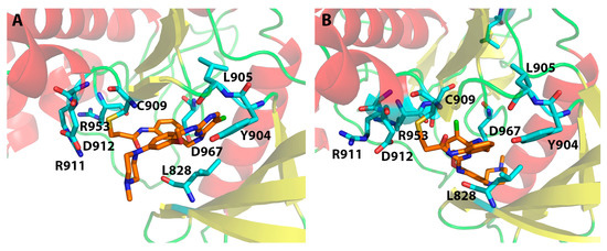 The docking study of 5TTV and compound 1 from the Schrödinger Covalent Dock method identified one H-bond interaction between the ligand and Arg911 (Table 3 and Figure 10A). The loss of the H-bond with Leu905 might, in part, contribute to the lower binding affinity with 5TTV (−7.31 kcal/mol vs. −10.29 kcal/mol in the 4Z16 model). Compound 11 interacts with 4Z16 with residues Asp912, Leu905, and Arg953, whereas it binds 5TTV with residue Leu905. The absence of interactions with Asp912 and Arg953 again may, in part, lead to weaker binding of compound 11 with the 5TTV model (−8.70 kcal/mol vs. −11.09 kcal/mol in the 4Z16 model). Similar binding behaviors were also observed in other ligands when they bound to 5TTV, thus contributing to a larger mean error in the 5TTV model. On the other hand, compound 1 was bound to 5TTV (under the MOE Covalent Dock method) with Asp912, Asp967, and Lys830. The smaller mean error (1.25 kcal/mol) for compound 1 may have come from more interactions that were identified (Figure 10B and Table S1).