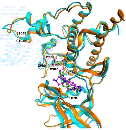 The superposition of the wild-type model 4Z16 (orange) and the C1048S mutant 5TTV (cyan). The bound ligand 4LH of 4Z16 is colored in magenta, and 7KX of 5TTV is colored in green. A covalent bond between the ligand and Cys909 is shown. Residues at 1048, 953, 982, 989, 990, 909, and 828 are labeled.