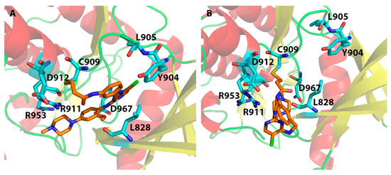 Our docking showed that the presence of an amide, phenol, morpholine, or an ether moiety sometimes would introduce additional interactions with residues such as Asp912, Leu828, and Cys909 (Table 2). The oxygen atom of the morpholine ring of compound 11 was able to form a H-bond with the Cys909 main chain NH group in both the Covalent Dock (Figure 6A) and the Glide Dock (Figure 6B).