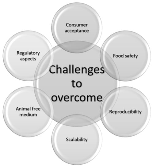 There have been significant advances in the CM field; however, no product is commercially available on a large scale. There are numerous technological and social challenges to this, as shown in Figure 1 [], that we will address in this review.