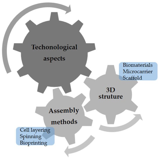 Initially, in vitro studies maintained the cells in a two-dimensional (2D) culture, which allowed for an understanding of the biological mechanisms underlying cell functions, such as migration and differentiation. Over time, interdisciplinary improvements were made, and the application of biomaterials in culture was essential for the creation of a three-dimensional (3D) environment. It is possible to simulate variable and complex topographies in which cells can more closely mimic the behaviors of their in vivo environments [,]. Figure 2 shows some technological aspects that must be considered for CM.