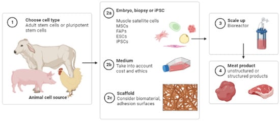 Instead of slaughtering animals for food, the meat cultivation process usually starts by obtaining a biopsy and isolating cells. Then, these cells are cultivated to grow and differentiate into skeletal muscle cells. This process can begin with different cell types, but stem cells are an obvious choice due to their ability to proliferate and to differentiate into several lineages []. The cells can be obtained from two sources: adult stem cells, which have a limited proliferative capacity, or pluripotent stem cells, which have an indefinite proliferative capacity. The cells usually employed for this application include: (1) muscle satellite cells that are muscle stem cells that can differentiate into myotubes, which is the target cell type; (2) mesenchymal stem/stromal cells (MSCs) that can differentiate into fibroblastic, chondrogenic or adipogenic cell lineages; (3) fibro-adipogenic progenitors (FAPs) that can generate adipocytes and fibroblasts; (4) embryonic stem cells (ESCs); and (5) induced pluripotent stem cells (iPSCs) that can differentiate into any cell type [].