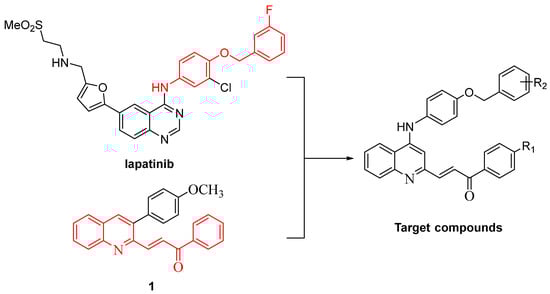 Lapatinib, a tyrosine kinase dual inhibitor targeting epidermal growth factor receptors (EGFR) and Her2/Neu, has been widely accepted in ongoing preclinical or clinical applications for the treatment of various solid tumors, including those of the breast, lung, liver, head and neck, colon, prostate, gastric and ovarian cancers [,,,]. Abo-Zeid et al. demonstrated that lapatinib exhibited cytotoxicity on the MDA-MB-231 cell line with an IC50 value of 32.5 μM after 24 h of treatment []. Chen et al. have also revealed IC50 values of 2.11, 3.42, and 4.85 μM, respectively, for the lapatinib-treated Huh-7, HepG2, and HA22T cancer cell lines []. To further explore 4-anilinoquinolinylchalcone derivatives as potential anticancer agents, a series of novel target compounds (Figure 1) were designed and synthesized. We considered the hybrid approach utilizing the chalcone structure of compound-1 and Phenylether amine substructure from lapatinib. The target structures are more drug-like with a shape similar to the compact cis-form of Combretastatin A4. They also possessed suitable molecular weights and the number of hydrogen-bond donating/accepting groups according to Lipinski’s rule of five. These target compounds were evaluated for their antiproliferative activities against the growth of Huh-7 and MDA-MB-231 cancer cell lines and MRC-5 (normal human lung cells), and the results are outlined in Table 1.
