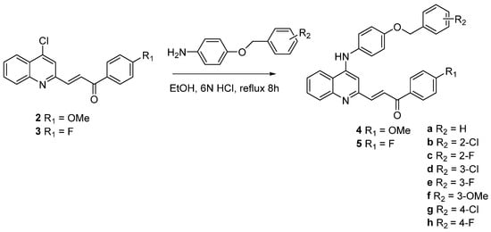 (E)-3-(4-Chloroquinolin-2-yl)-1-(4-methoxyphenyl)prop-2-en-1-ones (2) and (E)-3-(4-chloroquinolin-2-yl)-1-(4-fluoroxyphenyl)prop-2-en-1-ones (3), respectively, were reacted with substituted anilines to give the target 4-anilinoquinolinylchalcone derivatives (4a–h and 5a–h), respectively, (Scheme 1) as described in our previous report []. The structure of 4a–5h was determined by NMR (1H and 13C) (spectra data can be found in Supplementary Materials) and further confirmed by elemental analysis.
