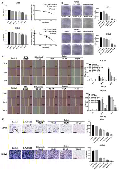 2.3. Butein Suppresses the Cell Viability, Migration, and Invasion of Ovarian Cancer Cells