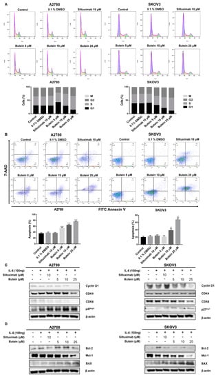 2.4. Butein Induced Ovarian Cancer Cell Cycle Arrest and Cell Apoptosis