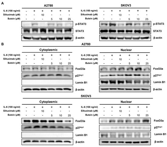 Park, S.-A.; Seo, Y.J.; Kim, L.K.; Kim, H.J.; Yoon, K.D.; Heo, T.-H. Butein Inhibits Cell Growth by Blocking the IL-6/IL-6Rα Interaction in Human Ovarian Cancer and by Regulation of the IL-6/STAT3/FoxO3a Pathway. Int. J. Mol. Sci. 2023, 24, 6038. https://doi.org/10.3390/ijms24076038