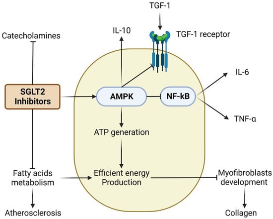 Activation of AMPK encourages efficient energy production, leading to the regulation of collagen formation. AMPK-induced inhibition of NF-kB leads to anti-inflammatory effects via suppression of IL6 and TNF-α release and stimulation of IL-10 formation. Additionally, SGLT2 inhibitors showed an antifibrotic effect by inhibition of TGF-1 receptors.