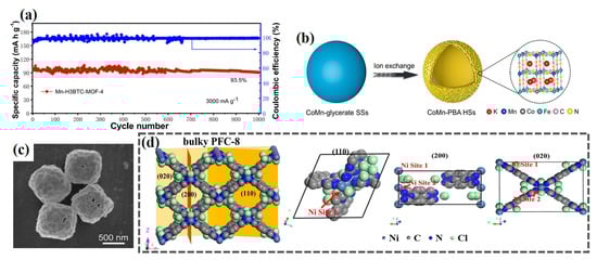 (a) Cycling performance of Mn-H3BTC-MOF-4 as the cathode for AZIBs at 3000 mA g−1 [53]. Copyright 2021, American Chemical Society. (b) The synthetic process of CoMn-PBA HSs [54]. Copyright 2021, John Wiley and Sons. (c) SEM image of CuMn-PBA DSNBs [55]. Copyright 2021, John Wiley and Sons. (d) Atomic structure of the PFC-8 framework with an illustration of (110)-, (200)-, and (020)-exposed crystal facets [56]. Copyright 2022, John Wiley and Sons.