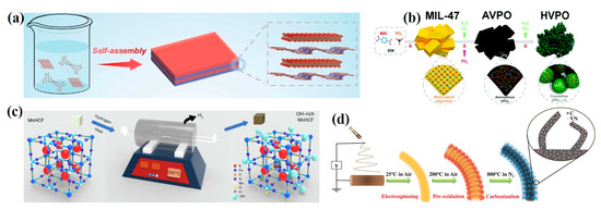 Schematic illustration of the formation process of (a) Cu-HHTP/MX [42]. Copyright 2023, John Wiley and Sons. (b) HVPO [74]. Copyright 2022, Royal Society of Chemistry. (c) OH-rich MnHCF [73]. Copyright 2023, Elsevier, and (d) VN/N-CNFs [75]. Copyright 2022, John Wiley and Sons.