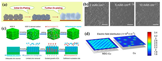 (a) Schematic illustration of the Zn plating on ZIF-8-500 electrode. (b) SEM images of Zn deposits at 1.0 mA cm−2 for different capacities [76]. Copyright 2019, Elsevier. (c) Schematic diagram of the electroplating/stripping principle of MDC. (d) Simulation of the electric field distribution of MDC–Cu and a planar bare Cu foil [77]. Copyright 2022, John Wiley and Sons.