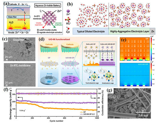 (a) Schematic illustration of Zn–I2 batteries with glass fiber (GF) separator and Zn-BTC membrane. (b) Solvation structure of typical diluted ZnSO4 solutions and high-aggregative electrolyte layer on Zn anode. (c) SEM images of Zn anode after cycling with GF separator and Zn-BTC membrane [81]. Copyright 2020, John Wiley and Sons. (d) Schematic illustration of AZIBs with UiO-66 functionalized glass fiber separator. (e) The electrical field models based on GF and UiO-66-GF separators. (f) Cycling performances and CEs of Zn|GF|MnO2 and Zn|UiO-66-GF|MnO2 cells at 1.0 A g−1 [82]. Copyright 2022, Springer Nature. (g) SEM images of UiO-66 modified a glass microfiber separator [83]. Copyright 2022, Elsevier.