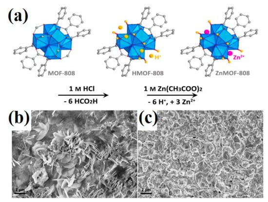 (a) Scheme for the post-synthetic of ZnMOF-808. SEM images of the Zn foils after plating/stripping cycles of (b) Zn|ZnSO4|Zn cell and (c) Zn|WZM|Zn cell [84]. Copyright 2019, Elsevier.