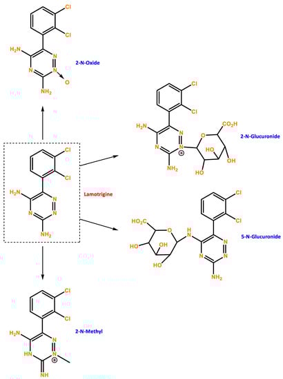 - Milosheska, D.; Lorber, B.; Vovk, T.; Kastelic, M.; Dolžan, V.; Grabnar, I. Pharmacokinetics of Lamotrigine and Its Metabolite N-2-glucuronide: Influence of Polymorphism of UDP-glucuronosyltransferases and Drug Transporters. Br. J. Clin. Pharm. 2016, 82, 399. [Google Scholar] [CrossRef] [PubMed]