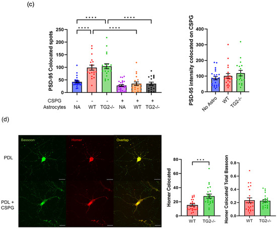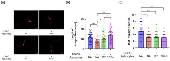 In our previous study, we found that astrocyte-specific deletion of TG2 in a mouse model significantly improved the rate and extent of functional recovery following an SCI [14]; therefore, we hypothesized that TG2−/− astrocytes would promote neurite outgrowth and/or synapse formation to a greater extent compared to wild type (WT) astrocytes. Neurons were grown on either a permissive matrix (poly-D-lysine [PDL]) or CSPGs to reflect the growth-inhibitory extracellular environment of the SCI core and surrounding regions of reactive tissue [32,33]. In the absence of astrocytes, neurite outgrowth was significantly reduced for neurons grown on the CSPG inhibitory matrix compared to those grown on a permissive PDL matrix (Figure 1a,b). WT or TG2−/− astrocytes were then paired with neurons grown on the inhibitory matrix using the transwell paradigm. This co-culture method allows for the free exchange of soluble secreted factors and metabolites between neurons and astrocytes. The quantification of maximum neurite length showed that TG2−/− astrocytes promoted significantly greater neurite outgrowth on the inhibitory matrix compared to WT astrocytes (Figure 1a,b). Interestingly, WT and TG2−/− astrocytes promoted similar neurite outgrowth when the neurons were on a permissive matrix (Figure 5b). Additionally, we quantified the total number of primary neurites; neurons grown on the inhibitory matrix had significantly fewer primary neurites than those grown on the permissive matrix. This CSPG-induced reduction in primary neurite number was unaffected by the presence of astrocytes, either WT or TG2−/− (Figure 1a,c). Together, these results indicate that, compared to WT astrocytes, TG2−/− astrocytes are better able to facilitate neurite outgrowth of neurons on an inhibitory, injury-relevant, matrix, entirely through the exchange of soluble factors. It should be noted that in other experiments we found that the effect of CSPGs on neurite outgrowth was dependent on the seeding density of the neuron culture; at higher seeding densities on CSPGs, the effect of TG2−/− astrocytes on neurite outgrowth was no longer significantly different from WT astrocytes (Figures S1 and S2).
