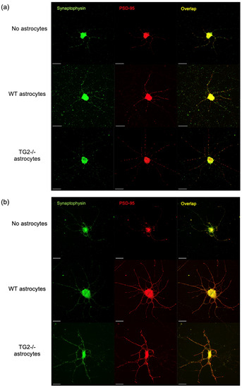 To assess whether in addition to promoting greater neurite outgrowth, TG2−/− astrocytes also promoted greater functional connectivity, we measured the extent of synapse formation in our neuron-astrocyte co-cultures. For these experiments, we paired a neuron-seeded glass coverslip with an astrocyte-seeded glass coverslip, separated by paraffin pedestals [34], allowing for the analysis of astrocyte cell densities in addition to synaptic densities on the neuron coverslips. For our synapse assays, we used the same groups as in the neurite outgrowth experiments, except that neurons were seeded at higher densities. Given that it has been reported that E18 primary cortical neuron cultures undergo rapid development of synapses starting from DIV 7, with peaking network activity at DIV14 [35,36], we paired neurons with astrocytes from DIV 7 to DIV 12 to compare the contributions of each group of astrocytes to synapse development during this critical period. Consistent with the important role of astrocytes in synaptic development, we found that pairing neurons grown on a permissive matrix with astrocytes significantly increased the number of excitatory pre-synaptic marker, synaptophysin and post-synaptic marker, PSD-95 colocalizations (S/P). However, there was no difference in effect between the TG2−/− and WT astrocytes (Figure 2c). This analysis was run in parallel with a second set of excitatory pre- and post-synaptic markers (bassoon and homer, B/H), which interestingly showed a significant difference in colocalizations between WT and TG2−/− astrocytes (Figure 2d). After normalizing B/H colocalizations to the total number of bassoon puncta, the two groups were no longer significantly different, indicating that greater incoming pre-synaptic projections, marked by bassoon, may account for the significant increase in synapse formation among neurons paired with TG2−/− astrocytes.