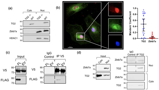 TG2 and Zbtb7a interact. (a) Nuclear (Nuc) and cytosolic (Cyto) fractions of wild type (WT) and TG2 knockout (TG2−/−) astrocytes. Intensity of bands are not representative of the proportion of the total protein in the cytosolic/nuclear fractions. (b) Immunocytochemistry showing co-localization of TG2 (green) and Zbtb7a (red) in nucleus (blue) of astrocytes. Quantification of co-localization of nuclear TG2 and Zbtb7a signal with the median Manders’ coefficient and 95% CI plotted (n = 30 from 2 independent biological replicates). (c) Left panel: Input controls of V5-TG2 and FLAG-Zbtb7a (FL) or empty vector (EV) transfected in HEK293TN cells. Right panel: Immunoprecipitation of V5-TG2 (V5) pulls down FLAG-Zbtb7a (FLAG). (d) Immunoprecipitation of endogenous TG2 from astrocyte nuclear fraction (nuc) pulls down Zbtb7a. Left panel: input, Right panel: immunoprecipitation with an IgG control or a TG2 antibody. In (c,d) vertical dashed lines indicate that intervening lanes were removed.
