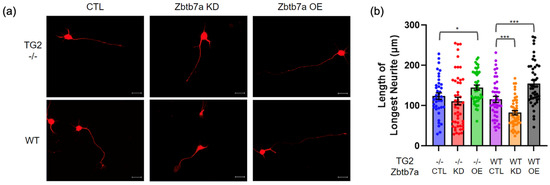 Pairing these astrocytes with neurons also revealed a differential impact of Zbtb7a manipulation based on the presence of TG2. As with the GFAP cytoskeletal effects, knocking down or overexpressing Zbtbt7a had a much greater effect on the ability of the WT astrocytes to support neurite outgrowth compared to TG2−/− astrocytes. This again suggests that TG2 mediates the effect of Zbtb7a, perhaps by preventing Zbtb7a from affecting the transcription of genes that are not necessarily directly regulated by TG2. It can be speculated that the interaction of TG2 with Zbtb7a may prevent it from interacting with chromatin areas where it usually binds to facilitate gene transcription [31]. It is possible that the differential effects of Zbtb7a manipulation, with and without TG2 present, on the astrocytic cytoskeleton and the ability of astrocytes to promote neurite outgrowth are related to the TG2 differentially regulated pathways we previously identified [14,16], but further studies are necessary to explore this supposition.