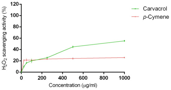 H2O2 scavenging action of carvacrol and p-cymene in the concentration range of 0–1000 μg/mL. Data are the mean ± SD of three experiments.