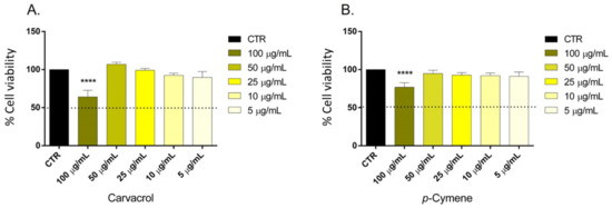 Cell viability calculated as a percentage after MTT assay. Cells were treated with different concentrations (5–100 μg/mL corresponding to 34–666 μM) of carvacrol (A) and p-cymene (B) for 24 h. Data are the mean ± SD of three experiments **** p < 0.0001 vs. control.