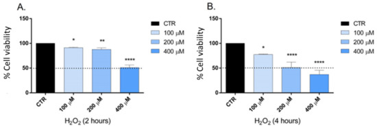 Cell viability calculated as a percentage after MTT assay. Cells were treated with different concentrations (100–400 μM) of H2O2 for 2 (A) and 4 h (B). Data are the mean ± SD of three experiments, * p < 0.05, ** p < 0.01, **** p < 0.0001 vs. control.