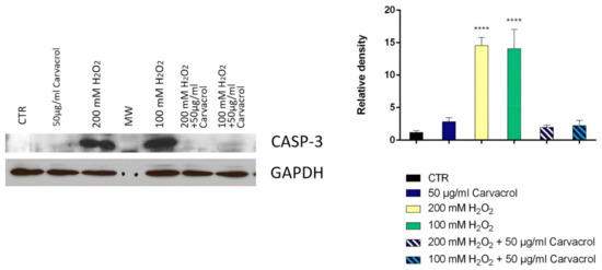 Relative expression levels of the caspase-3 protein in SH-SY5Y cells treated with carvacrol and H2O2. The panel shows the densitometry of bands in the treated group and control. Values are the mean ± SD in each group (n = 3). **** p < 0.0001 compared to control (ANOVA followed by Dunnett’s multiple comparison test).