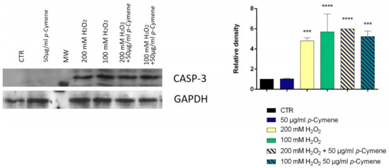 The ability to inhibit cell growth and the treatment time were considered as two critical parameters in determining the optimal concentration of H2O2 to be used in the test. Hydrogen peroxide is an oxidative stress inducer in several cell lines; the optimal concentration and treatment time used varied in each study according to the objectives [35]. Our study selected the optimal concentration of H2O2 and the time treatment to obtain a cell viability of at least 80%. The cell viability was determined using the MTT test after two and four h of treatment (Figure 3). After these preliminary experiments, 100 and 200 μM represented the concentrations chosen, and two h was the appropriate treatment time. The SH-SY5Y cells were pretreated with carvacrol and p-cymene to understand if these substances could exert a neuroprotective effect on H2O2-induced stress; subsequently, the cells were treated with H2O2 for 2 h; then, we performed their lysis and protein extraction. The results demonstrate that caspase-3 expression significantly increased in neuroblastoma cells treated with 100 and 200 mM H2O2 for 2 h compared to control cells (Figure 4 and Figure 5). Furthermore, following pretreatment with carvacrol (50 μg/mL) for 22 h, caspase-3 was inhibited, and its expression was similar to that of untreated cells and cells treated with carvacrol alone (50 μg/mL) (Figure 4). In contrast, in the pretreatment with p-cymene (50 μg/mL), the expression of caspase-3 increased similarly to the cells treated with 100 or 200 mM H2O2. Our results demonstrate that carvacrol exerted a more significant neuroprotective effect on H2O2-induced stress than p-cymene, confirming the results of the previous cell-free assay on H2O2 scavenging activity.