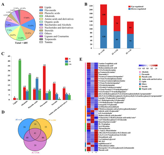 To better understand the metabolic differences between rhizomes from different germplasms of P. cyrtonema from the Wuyi Mountains, a widely targeted metabolomics analysis of one-year-old rhizomes from the JL, JZ and GK germplasms was performed. A total of 685 metabolites in 13 classes were identified, including 121 lipids, 92 flavonoids, 85 phenolic acids, 76 alkaloids, 69 amino acids and their derivatives, 53 organic acids, 51 saccharides and alcohols, 35 nucleotides and their derivatives, 31 steroids, 30 other classes of metabolites, 25 lignans and coumarins, 16 terpenoids, and one tannin (Figure 2A).