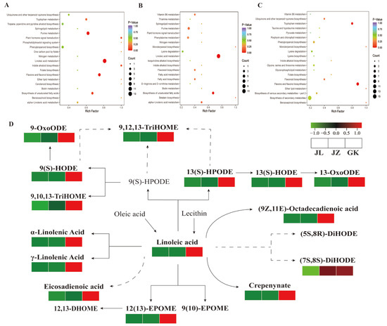 (A–C) KEGG enrichment plots of differential metabolites from different germplasms comparison groups, (A) JL vs. GK, (B) JZ vs. GK, (C) JZ vs. JL, (D) Distribution of differential metabolites from different germplasms P. cyrtonema linoleic acid and unsaturated fatty acid biosynthetic pathways, grey font represents non-detected metabolites, solid arrows represent individual reactions, and the dashed arrows indicate conversions with multiple steps catalysed.