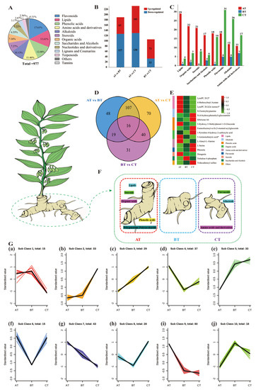 A total of 331 differential metabolites were identified from the AT vs. BT, AT vs. CT, and BT vs. CT comparisons. Of these, 190 differential (127 downregulated and 63 upregulated) metabolites were identified from the AT vs. BT comparison, and these mainly included alkaloids, flavonoids, organic acids, saccharides and alcohols, amino acids and their derivatives, phenolic acids, steroids, and lipids. In addition, 233 differential (130 downregulated and 103 upregulated) metabolites, which mainly included alkaloids, lipids, phenolic acids, organic acids, amino acids and their derivatives, flavonoids, and saccharides and alcohols, were identified in AT vs. CT comparison, and 106 differential (33 downregulated and 73 upregulated) metabolites, which mainly comprised flavonoids and alkaloids, were detected from the BT vs. CT comparison (Figure 4B). Venn diagrams of the three sets of differential metabolites (those obtained from the AT vs. BT, AT vs. CT, and BT vs. CT comparisons) were plotted, and 9/16 classes sharing differential metabolites were further screened (Figure 4D,E, Table S3). These nine classes of differential metabolites included three lipids, three phenolic acids, two alkaloids, two amino acids and their derivatives, two organic acids, one flavonoid, one steroid, one sugar and alcohol, and one other class (Figure 4E), which could be used as markers to distinguish between one-, two-, and three-year sections of rhizomes.