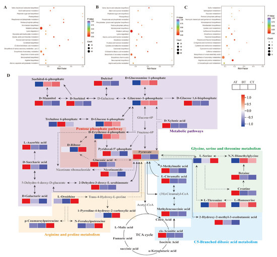 This study performed KEGG differential metabolite enrichment analyses of three age sections of P. cyrtonema (AT, BT, and CT). Ninety-nine, 112 and 25 differential metabolites identified from the AT vs. BT, AT vs. CT, and BT vs. CT comparisons, respectively, were annotated to the corresponding metabolic pathways. The differential metabolites screened with significant enrichment (p < 0.05) were enriched in a total of 81 metabolic pathways, mainly including C5-diacid metabolism (ko00660), the pentose phosphate pathway (ko00030), arginine and proline metabolism (ko00330), metabolic pathways (ko01100), and glycine, serine and threonine metabolic (ko00260) pathways (Figure 5A–C).
