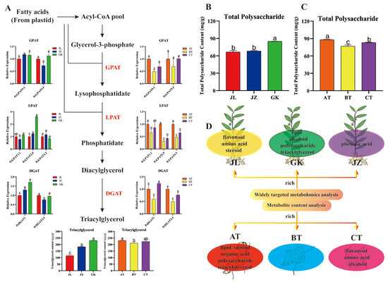 Previous studies have found that TAGs are the main energy reserve in the form of lipids and play an important role in resisting the stress from adversity [16]. In this study, a total of 10 glycerides were identified in rhizomes from the three germplasms (JL, JZ, and GK). Four of these metabolites were differential glycerides and expressed at the highest levels in the GK germplasm. Therefore, these findings indicate that the GK germplasm may contain higher levels of TAG. Subsequently, this study measured the TAG contents in the three germplasms (JL, JZ, and GK) and detected a significantly higher level in the GK germplasm (230.87 μg/g) than in the JL (115.31 μg/g) and JZ germplasms (182.80 μg/g) (Figure 6A), suggesting that the GK germplasm may exhibit greater resistance to stress due to its higher TAG content. Interestingly, among the GK germplasm rhizome sections of different ages (AT, BT, and CT), the highest TAG content (230.87 μg/g) was observed in the AT age section, followed by the CT age section (223.2 μg/g), and the lowest was found in the BT age section (210.93 μg/g) (Figure 6A). Thus, the AT age section could be used in production as a material for the asexual propagation of Polygonatum species.