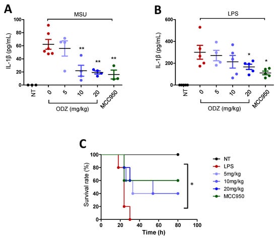 2.8. ODZ Attenuates IL-1β Release in the MSU-Induced Peritonitis Model and Mortality in the LPS-Induced Sepsis Model in Mice