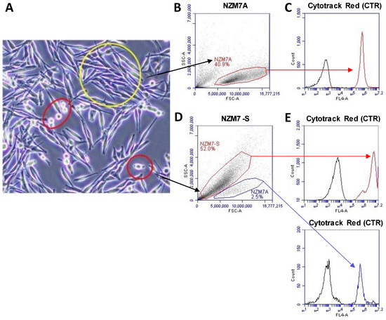 NZM7 imaging and gating strategies. (A) NZM7 cell line in culture. Yellow circle shows NZM7A, red circles show NZM7-S. (B,D) Scatter profile of gated NZM7A and NZM7-S according to density in y-axis (SSC-A) and size in x-axis (FSC-A). (C,E-top) CTR fluorescence (red) of the suspension population compared to the cells autofluorescence (black) as measured in channel FL4-672/25 filter. (E-bottom) CTR fluorescence (blue) of the NZM7A population in the NZM7-S collection. Data show 1 representative experiment, which is from 3 independent experiments.
